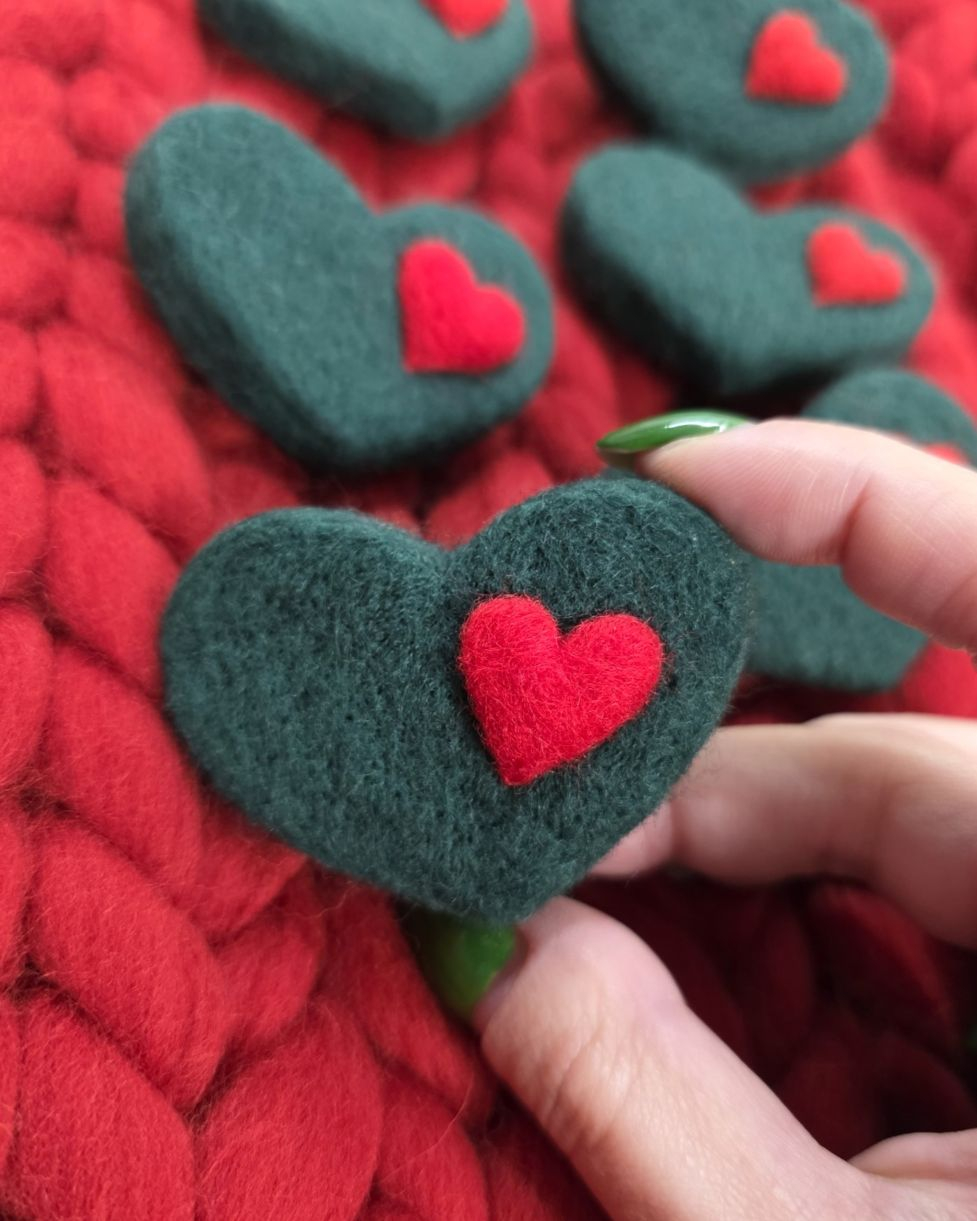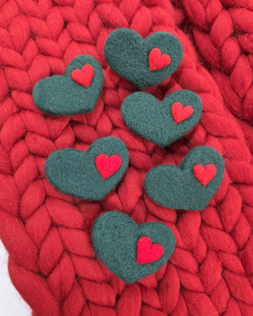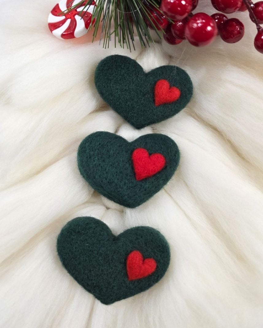 Aceste broșe lucrate manual din lână merinos surprind spiritul sărbătorilor prin contrastul clasic: verde brad și roșu aprins. Sunt realizate prin împâslire cu acul, transformând lâna pufoasă într-o bijuterie textilă durabilă și plină de farmec.