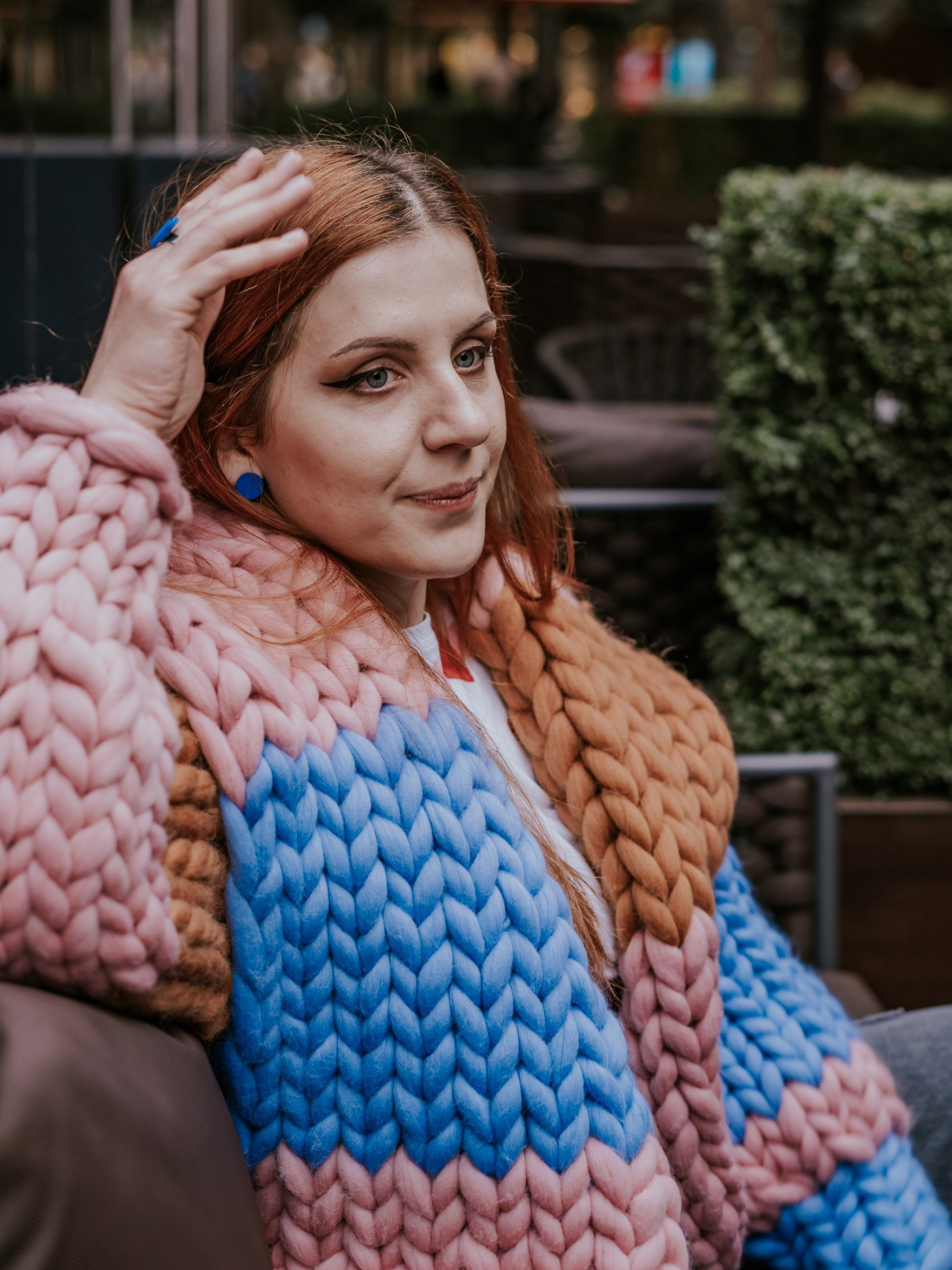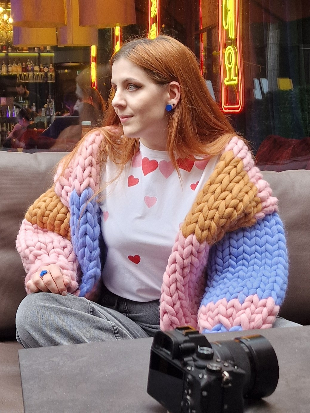 Acest cardigan oversized este tricotat manual cu fir gros de lână merinos, într-un amestec jucăuș de roz, albastru și brun – ca o acuarelă purtată pe umeri. Fiecare ochi este lucrat cu mâinile, fără andrele, iar rezultatul este o piesă sculpturală, vibrantă și extrem de cozy. Se potrivește perfect peste o ținută simplă, adăugând volum, textură și un strop de magie.