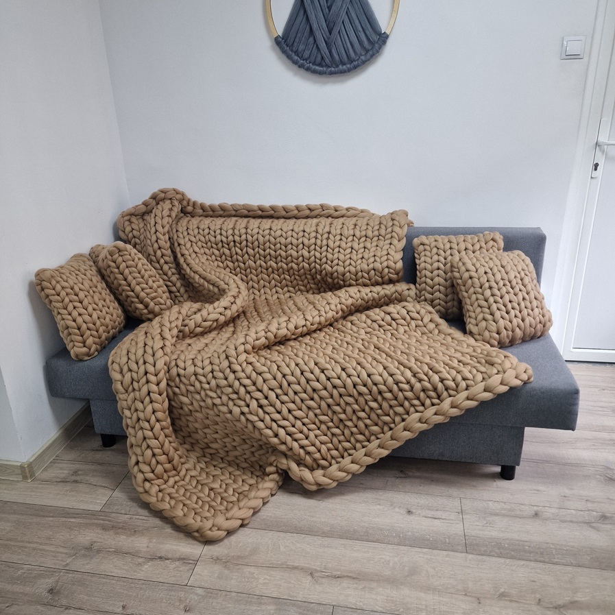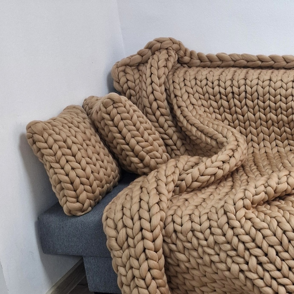 Pătură tricotată din fir gigant, lână merinos, bej